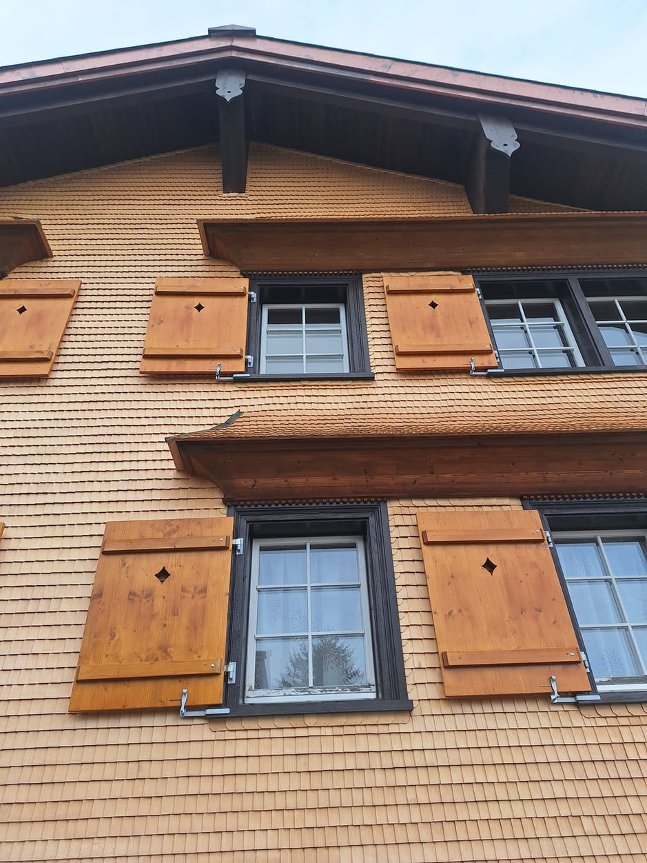 Traditionelle Ausführung einer hochwertigen Holzschindelfassade aus einheimischem Fichtenholz mit individuell ausgearbeiteten Details.